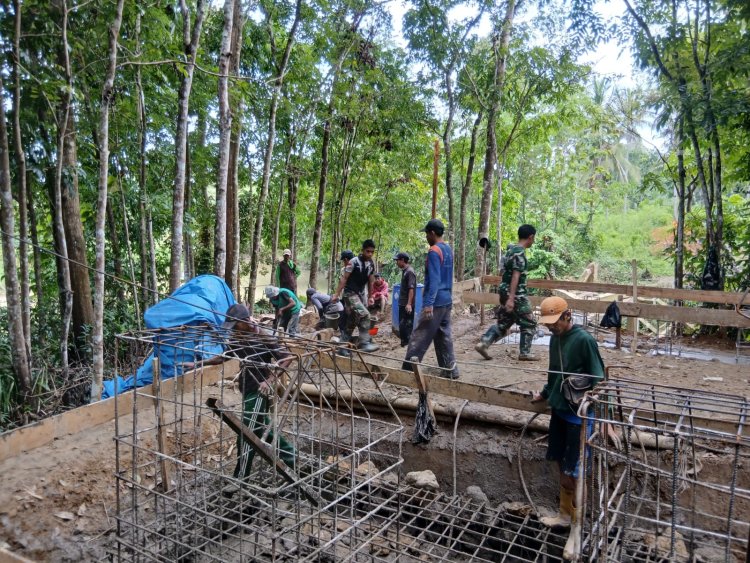Di tengah kondisi medan yang cukup menantang dan dikelilingi area hutan, personel TNI bersama warga tampak bahu-membahu mengangkut material, merakit besi rangka, hingga melakukan pengecoran secara manual. Kekompakan antara aparat dan masyarakat menjadi kunci utama dalam percepatan pembangunan infrastruktur tersebut.