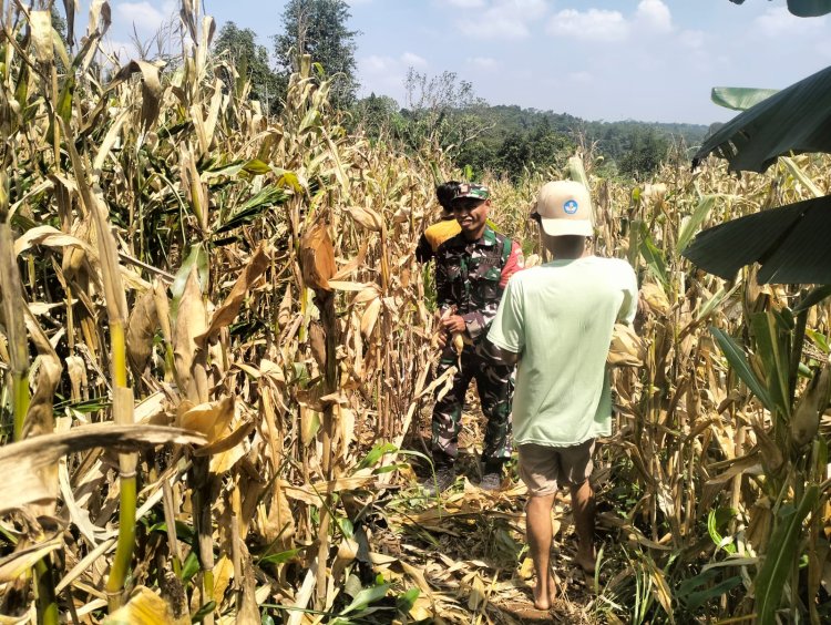 Kegiatan panen raya tersebut berlangsung dalam suasana penuh kebersamaan. Para peserta yang hadir tampak berada di hamparan kebun jagung yang siap panen, menunjukkan hasil kerja keras para petani setempat. Dalam foto terlihat para peserta kegiatan, termasuk Babinsa dan penyuluh pertanian, sedang memantau kualitas hasil panen serta berdialog langsung dengan petani di lapangan. Pendampingan ini menjadi bentuk dukungan nyata TNI AD melalui Babinsa terhadap para petani dalam meningkatkan produktivitas pertanian daerah.